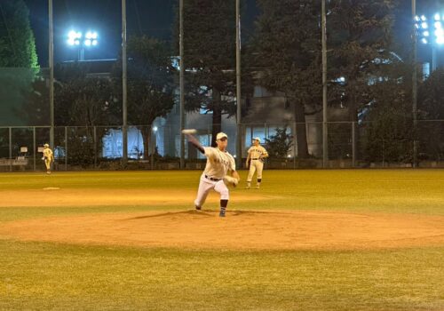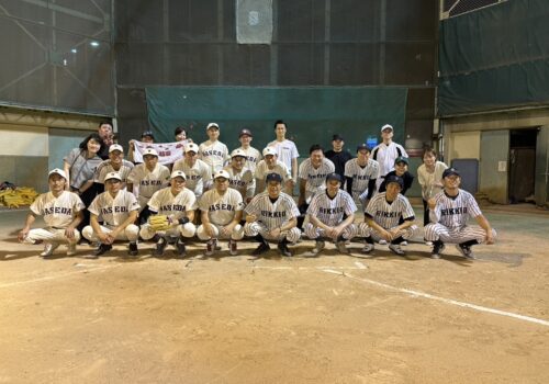 その後は、両チームのピッチャーの頑張りで締まった展開となり、稲門会は4回から東條が登板。テンポよくSB会打線を零封し、8対1で勝利。4戦全勝となりました。