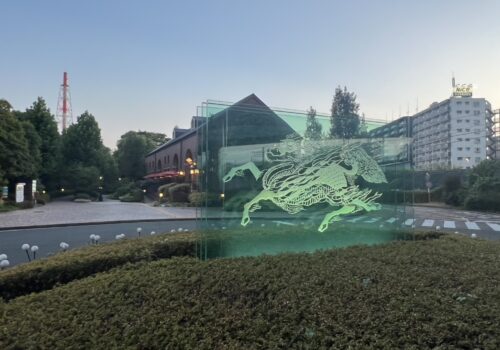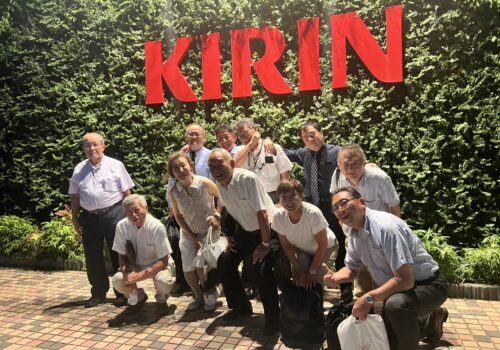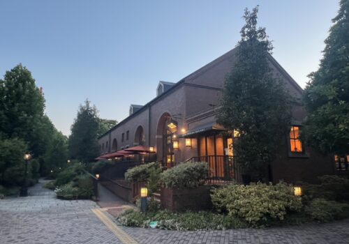 今回は都心の喧騒を離れ、生麦にあるキリンビール横浜工場内のビアホール『キリンビアビレッジ』にて、出来たてのビールと美味しいお料理をいただきながら、懇親を深めました。この日も猛暑日でしたが、夕闇迫るころ、キリンビール工場前へ。まずは瀟洒な煉瓦造りの洋館が出迎えてくれました。